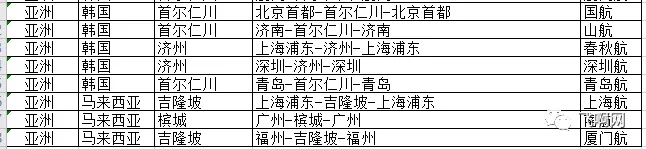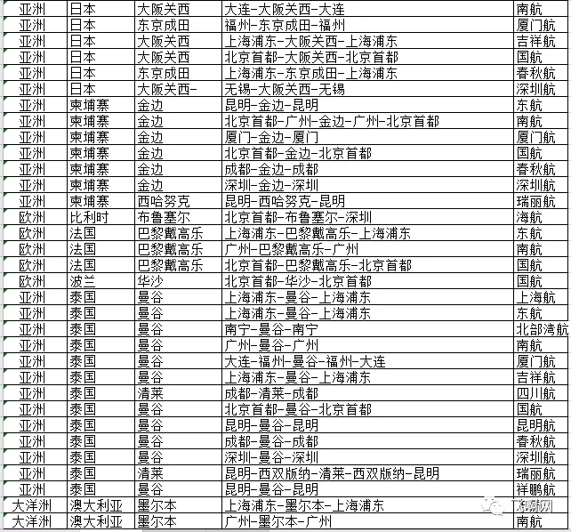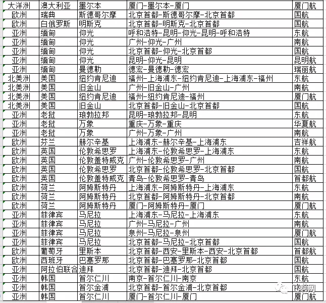 中方航司国际客运航班如下表(107班)