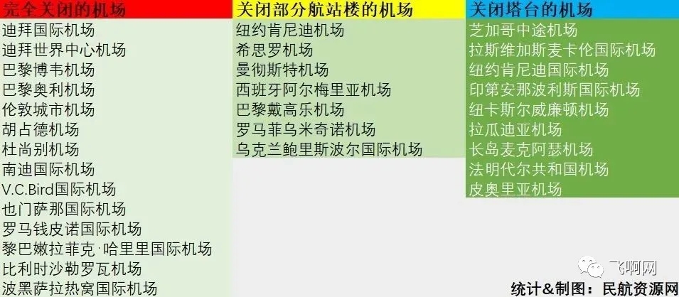 此外,截至到3月26日,根据民航资源网的不完全统计,全球共有下面14座机场关闭,7座机场部分关闭航站楼;9家机场关闭塔台。(这一数据还在不断更新中)