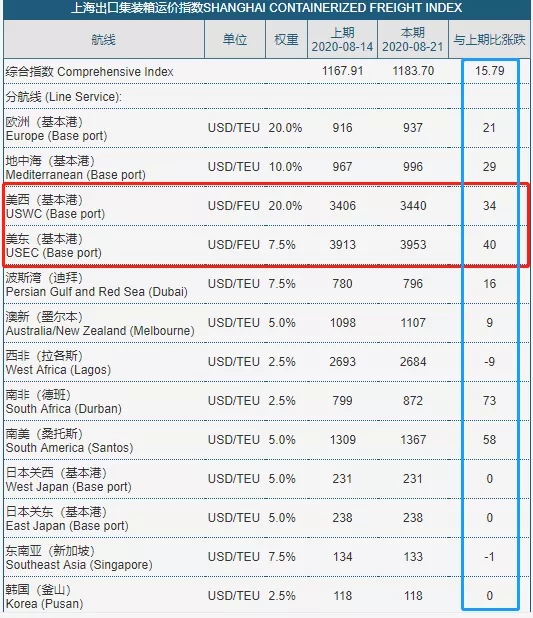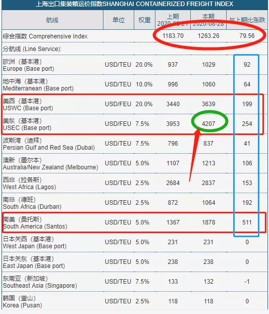 8月28日,上海航运交易所发布的上海出口集装箱综合运价指数上涨79.56点到1263.26点(8月21日指数为1183.70点),继续大幅上扬,较上期上涨6.7%。大部分航线运价上调幅度较大,综合指数上涨。美东突破4200美元/FEU大关。